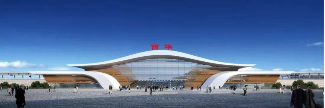 车站造型以古韵西华为设计主题,融入女娲飞舞时的优美身姿,造型柔美灵动。通过两侧形体承托屋顶的形式,表现托举感、力量感。