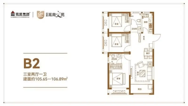 建面约105.65-106.89㎡户型 (B2户型 三室两厅两卫):户型方正通透,实现动静分离。厨房为L型设计,空间宽敞。南向阔尺瞰景阳台连接客餐厅,主卧采用套房设计,配备独立卫浴,私密性强。