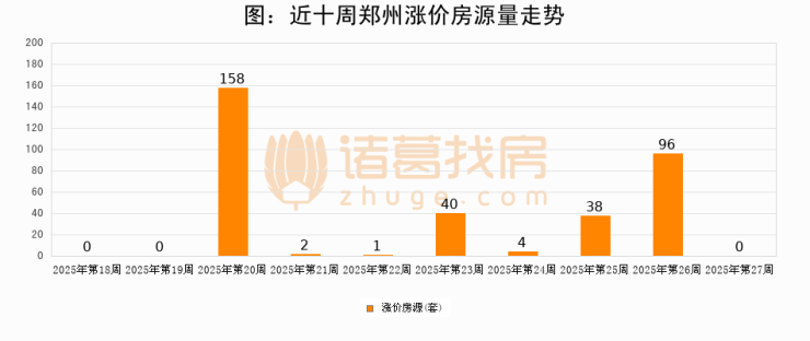 从调价房源来看,第27周郑州涨价房源0套,较上周下降100%。与此同时,27周涨价房源占比回落4.87个百分点,业主信心小幅波动,购房者可则需入市。