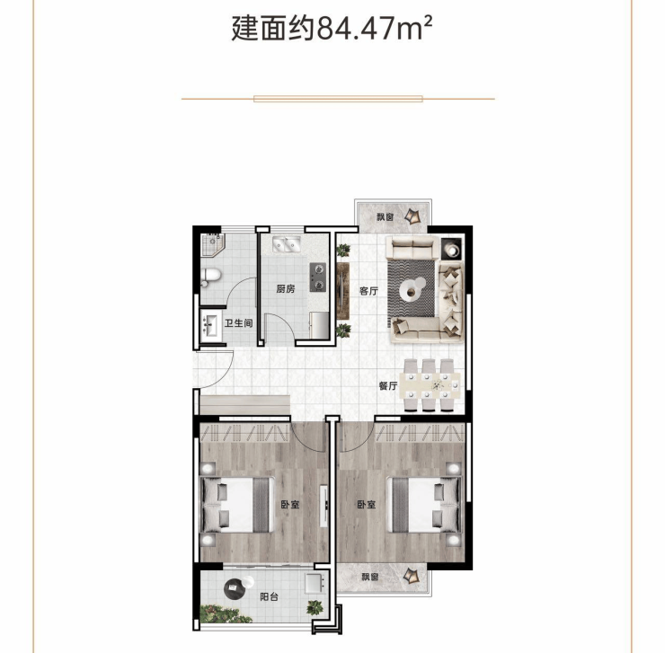 1、84.47㎡两室两厅一厨一卫,房源充足