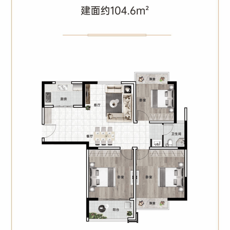 2、104.61㎡三室两厅一厨一卫,房源充足