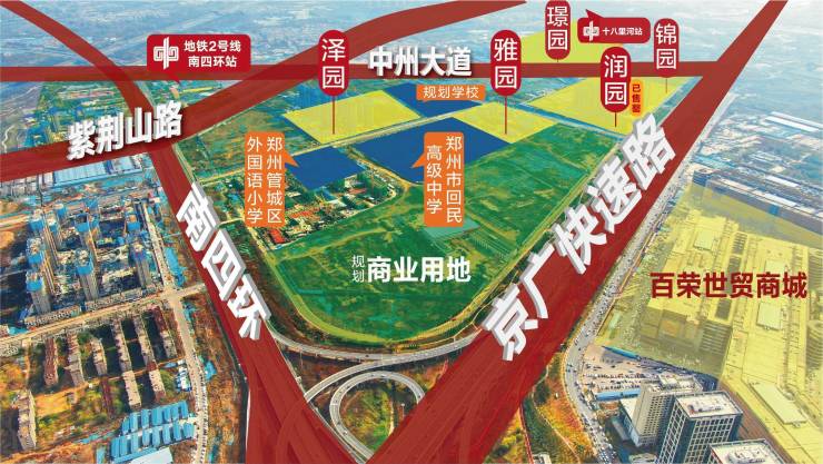 交通:东侧连接中州大道,西侧连接京广快速路,北侧连接南四环快速路,附近有地铁2号线(南四环站、十八里河站),紫荆山路从地块内部穿过,交通出行四通八达。