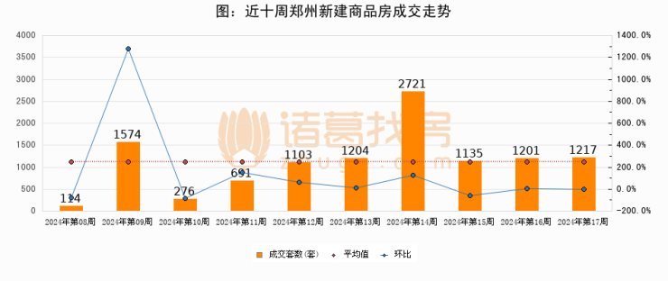进入2024年第16周(04月15日-04月21日),郑州新建商品房成交1217套,较上周增加16套,环比上涨1.3%