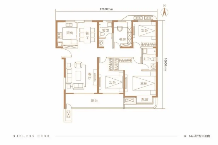 建面约142㎡户型 (四室两厅两卫):户型方正通透,实现三开间朝南布局,舒享满屋阳光。餐客厅相连,空间阔绰。约7.2米南向宽境阳台美观实用。多一室空间可灵活作为书房、客房或活动室,功能百变。