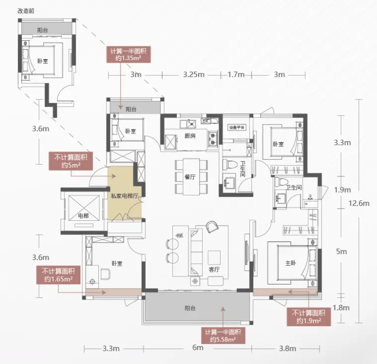 户型采用创新的 LDKG一体化 空间设计(即客厅、餐厅、厨房、阳台一体化连通),带来约6米的超大宽厅,并与约1.8米进深的全景阳台相连,极大扩展了家庭的社交场域与观景视野。户型内外方正,有效避免了面积浪费。结合私享的约5㎡电梯前厅,共同构成了一个私密、通透、实用且充满生活仪式感的品质家庭空间,是高新区改善客群一步到位的终极选择。