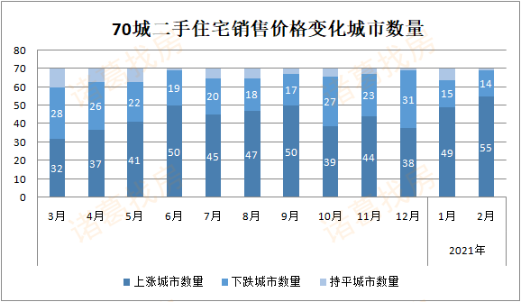 2021年2月份,全国70个大中城市中,二手住宅销售价格上涨城市数量增至55个,较上月增加6个,为去年以来的峰值;下跌城市数量为14个,较上月减少1个;持平城市数量为1个,较上月减少5个。