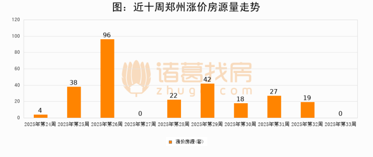 从调价房源来看,第33周郑州涨价房源0套,较上周下降100%。与此同时,33周涨价房源占比提升40.62个百分点,业主信心持续恢复。