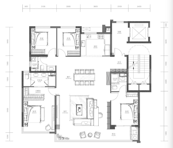 此户型是洋房产品的代表,规划为四房三卫。通常享有更优的梯户比、更高的得房率及更静谧的社区位置。其奢阔的尺度、完备的套房设计,旨在满足塔尖改善家庭对空间、私密、舒适与身份的全面高阶要求。