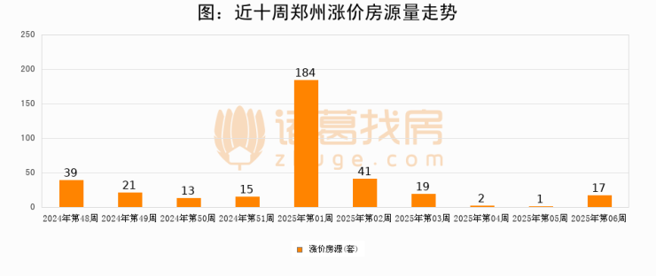 从调价房源来看,第6周郑州涨价房源17套,较上周上涨1600%。与此同时,6周涨价房源占比提升2.48个百分点,业主信心持续恢复。
