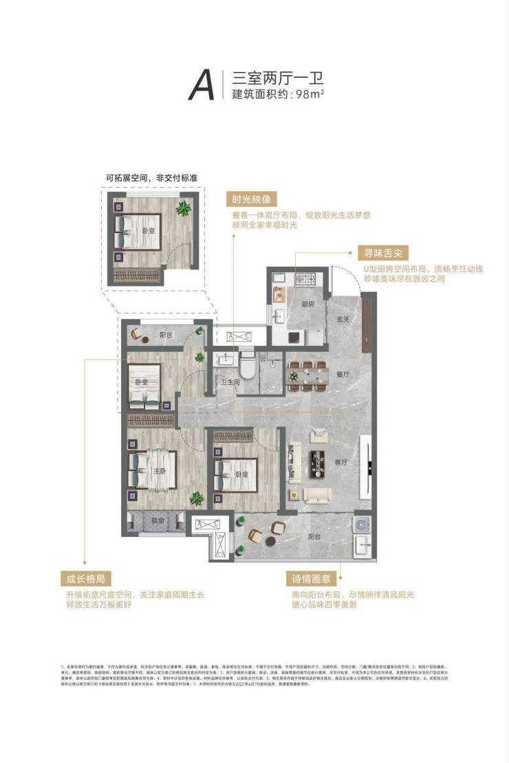 建筑面积约98平三室两厅一卫:双卧客厅朝南;餐客分离;动静分区;户型方正;南北通透。
