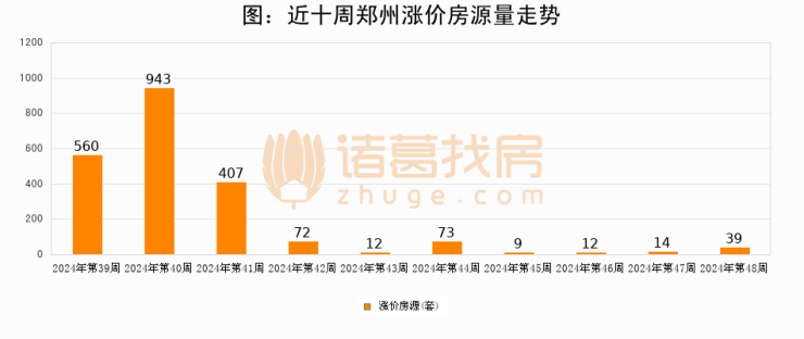 从调价房源来看,第48周郑州涨价房源39套,较上周上涨178.6%。与此同时,48周涨价房源占比提升1.19个百分点,业主信心持续恢复。