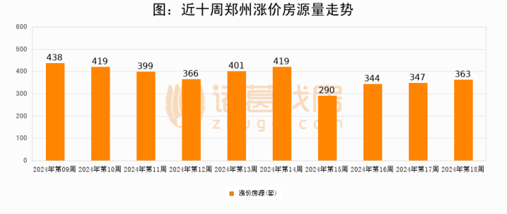 从调价房源来看,第17周郑州涨价房源363套,较上周上涨4.6%。与此同时,17周涨价房源占比提升0.47个百分点,业主信心持续恢复。