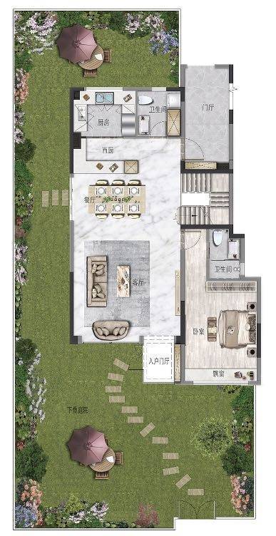 下叠1层平面图U型厨房空间利用率高,提供高效的操作空间中岛式厨房方便操作,增加互动,增加生活乐趣餐客一体,超大空间入口玄关对景玄关,加强入户体验私家花园南北双向私人花园尽享自然