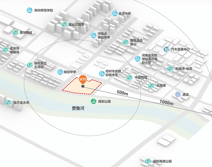 郑州惠济区北大学城板块,对望贾鲁河一线河景,距离惠济区政府约5.0KM、惠济区万达广场约3.4KM、黄河花园口旅游区约 5.5KM,紧邻城市主干道,交通资源完备,教育资源丰富,“自然风光、黄河文化和慢生活”三大特点兼收并蓄,是郑州名副其实的后花园。