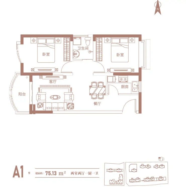 建面约75㎡户型 (臻稀两房):该户型是入主东二环核心地段的超低门槛之选。在保证居住功能完整性的前提下,实现了总价的有效控制,极为稀缺,适配单身精英、新婚夫妇及资产配置需求。