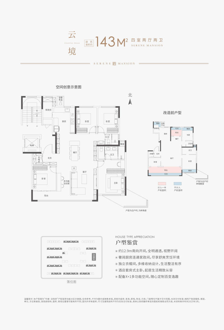 建筑面积约127-188㎡奢阔洋房,全系超100%得房率;底层大私家院落,顶层天幕星空露台,围合天地与美满。
