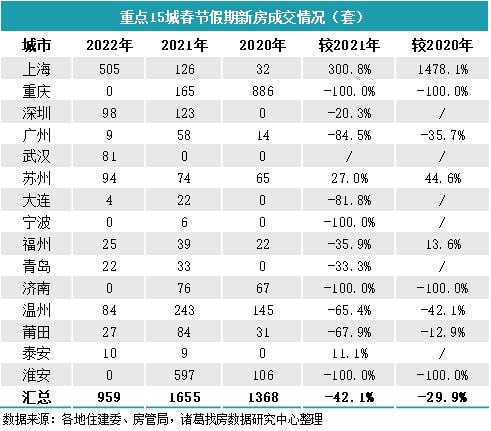 另外,据诸葛找房数据显示,2022年春节假期重点15城新房成交959套,创近5年新低,同比去年春节下跌42.1%。