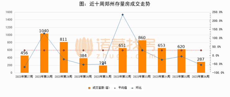 进入2025年第36周(09月01日-09月07日),郑州新建商品房成交287套,较上周减少333套,环比下降53.7%
