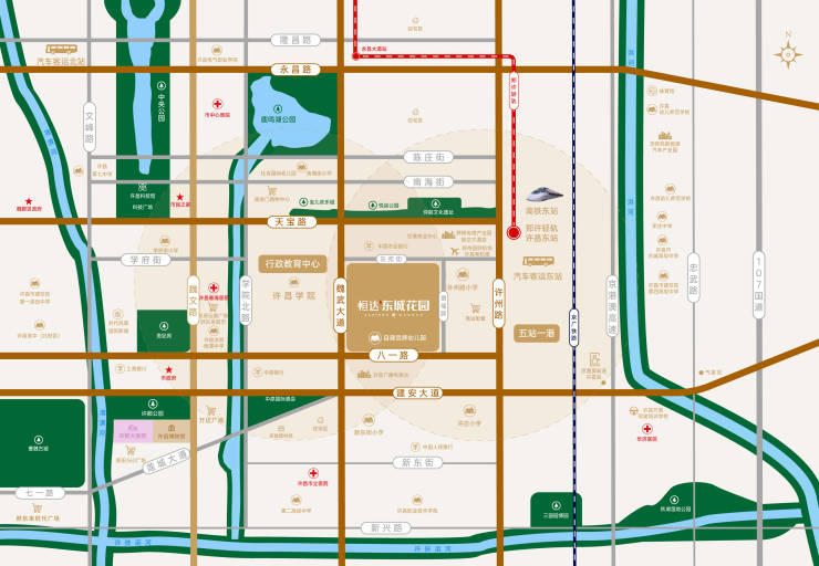 恒达·东城花园占位两大城市主轴,坐拥公交站、客运站、高铁站、轻轨站、京港澳高速许昌站、候机楼五站一港交通资源,家门口畅达世界。周边天使城、万达广场等醇熟商业加持,尽享城市的繁华与便利,尊享品质生活。