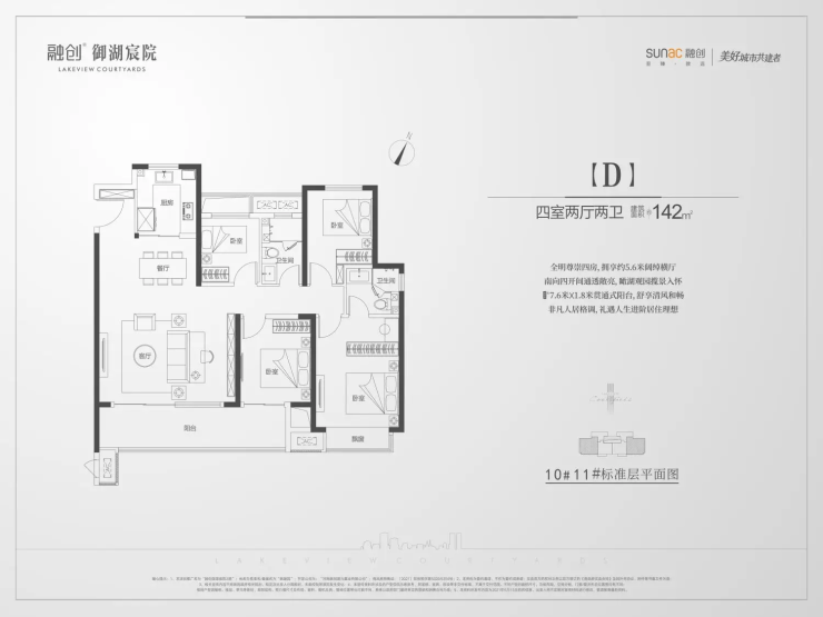 建面约142㎡户型 (四室两厅两卫):全明格局,约5.6米奢阔横厅设计,南向四开间极致采光,7.6米×1.8米贯通式阳台打造空中观景长廊,空间尺度比肩大平层,是高端改善客群的终选之宅。
