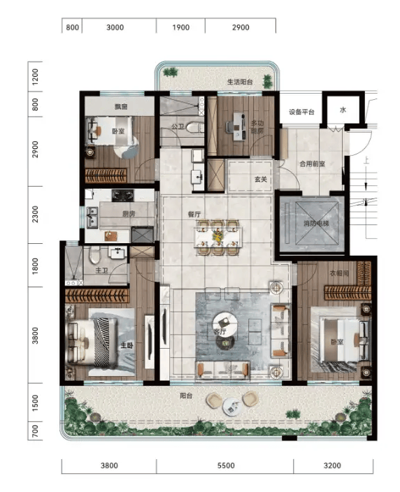 作为功能性三房,三开间朝南,餐客一体连接约10.1米阳台,空间利用率高,是品质生活的精睿之选。