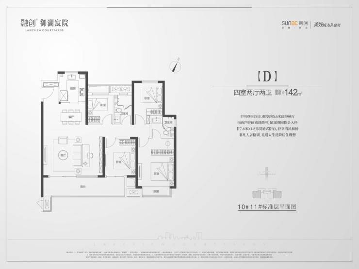 :全明格局,约 5.6 米横厅设计,南向四开间,7.6 米 ×1.8 米贯通式阳台,空间尺度阔绰,高端改善首选。