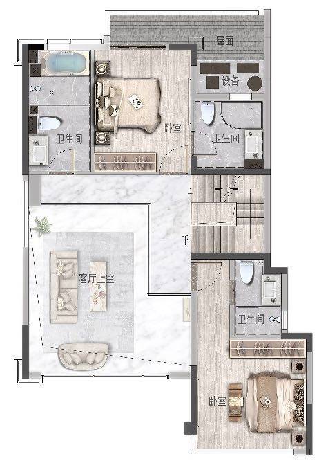 下叠2层平面图主卫四件套舒适空间,尽享尊贵生活套房四套间设计,私密性强,体验尊贵南向阳台270°观景体验,舒适又美观