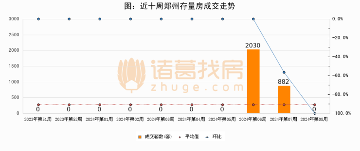 存量房方面,第07周郑州存量房成交0套,较上周减少882套,环比下降100%。从近十周成交走势来看,周均成交套数为291套,本周低于平均水平100%。