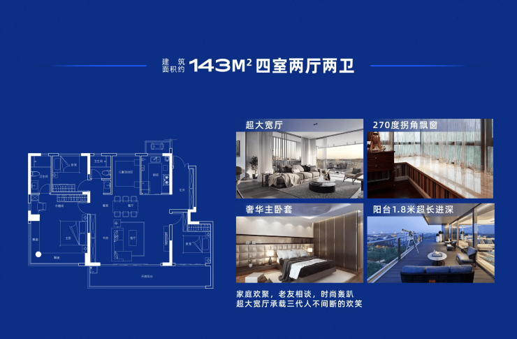 建面约143㎡户型 (观澜 四室两厅两卫):作为滨河洋房产品,空间更为奢阔。拥有约14.45米的阔绰南向开间及长约9.75米的南向开敞观景阳台,河岸生活尺度非凡。约30㎡的奢阔主卧套间自成一方私域天地,同样配备270°转角飘窗,将一线河景最大化引入室内。