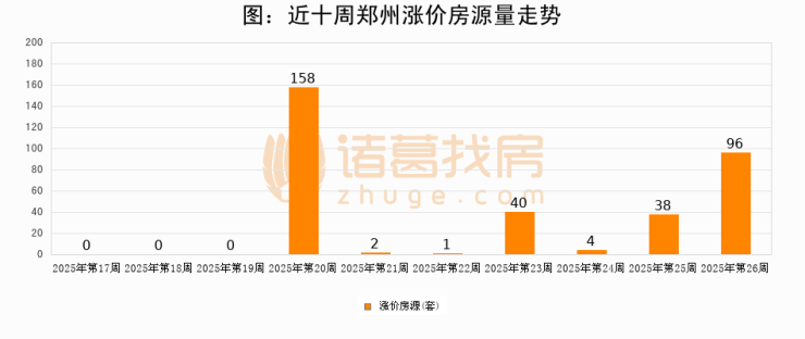 从调价房源来看,第26周郑州涨价房源96套,较上周上涨152.6%。与此同时,26周涨价房源占比回落7.04个百分点,业主信心小幅波动,购房者可则需入市。