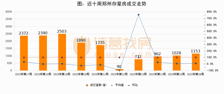 存量房方面,第26周郑州存量房成交1153套,较上周增加125套,环比上涨12.2%。从近十周成交走势来看,周均成交套数为1489套,本周低于平均水平22.6%。