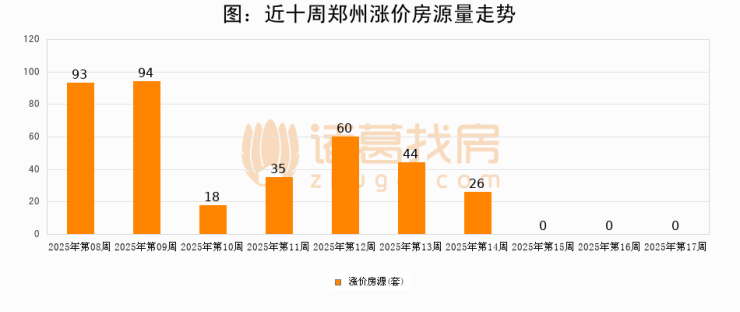 从调价房源来看,第17周郑州涨价房源0套,较上周持平。与此同时,17周涨价房源占比持平