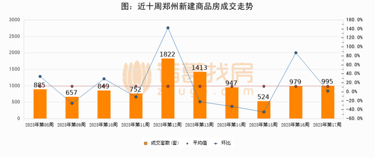 进入2025年第17周(04月21日-04月27日),郑州新建商品房成交995套,较上周增加16套,环比上涨1.6%