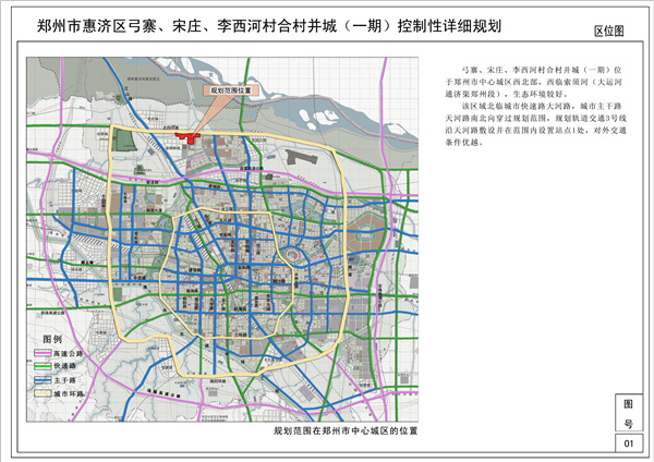 弓寨、宋庄、李西河村合村并城(一期)位于郑州市中心城区西北部——惠济区,西临索须河(大运河通济渠郑州段),生态环境较好。