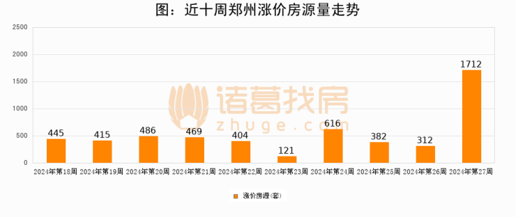 从调价房源来看,第27周郑州涨价房源1712套,较上周上涨448.7%。与此同时,27周涨价房源占比提升13.82个百分点,业主信心持续恢复。