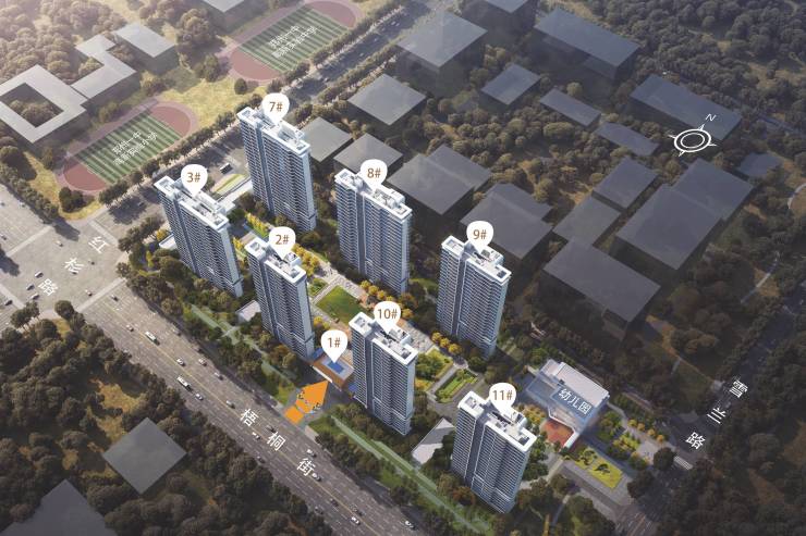 产品规划:共7栋24-26层小高层住宅一栋幼儿园+ 900方社区底商