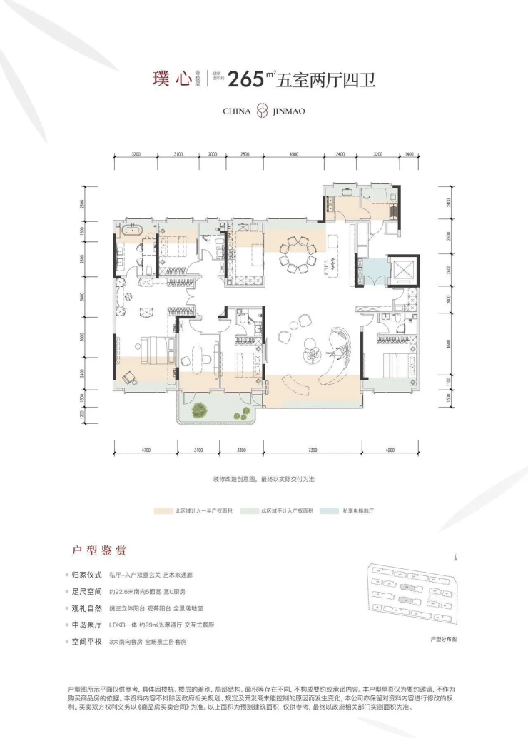项目主力产品为建筑面积约172㎡、197㎡、230㎡、265㎡及306㎡的精装大平层,以全装修高标准交付,满足世家大族对空间与功能的终极要求。