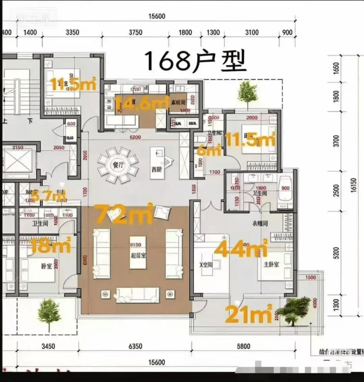 建面约168㎡户型 (四室两厅):得房率约120%,空间尺度全面进阶。各功能分区更为奢阔,适配深度改善家庭对品质与私密的双重需求。