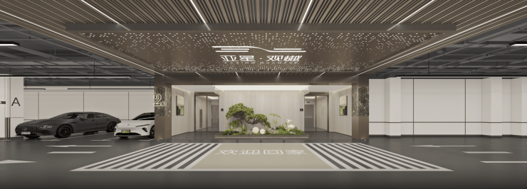 星空顶车库——车库星空吊顶设计,柔和光影交织璀璨银河;地面铺装水磨石,光可鉴人;细节之处尽显奢华品质与卓越工艺