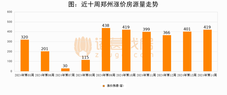 从调价房源来看,第13周郑州涨价房源419套,较上周上涨4.5%。与此同时,13周涨价房源占比提升0.29个百分点,业主信心持续恢复。