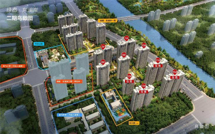 【绿都·东澜岸】二期总占地84亩,总建筑面积约26万㎡,由9栋高层和沿街商业组成,容积率3.491,绿地率39.79%,东临杨桥大道、西侧龙飞北街、北侧金秋路、南侧祥瑞路。