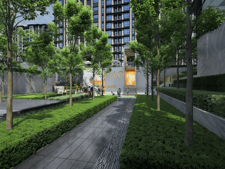 鼎配园林:社区配置区域内罕见的约2000㎡下沉式庭院,形成全家人的森境会客厅;同时规划9个宅间花园景观组团,实现游园式居住体验。