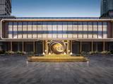 而西侧是约8米宽,3米高的极具现代酒店风格的艺术景墙来隐藏入口,整面景墙采用高级灰仿石材立面,加上精工细琢的雅金色金属线条,彰显出端庄、典雅的现代艺术感。同时伴有园区内的潺潺水流之声,引人入胜,给人一种寻溪探林的归家谧静。