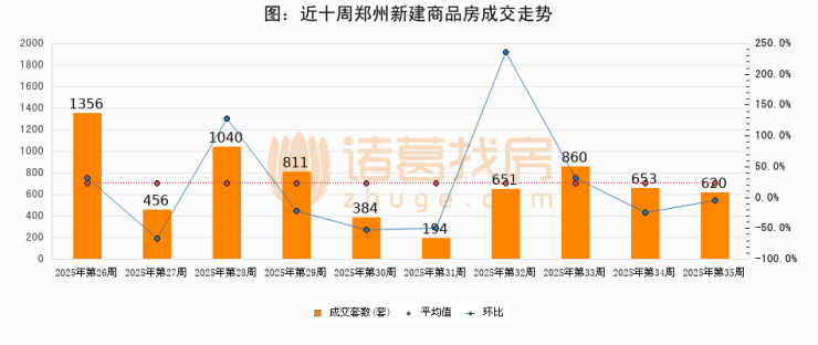进入2025年第35周(08月25日-08月31日),郑州新建商品房成交620套,较上周减少33套,环比下降5.1%