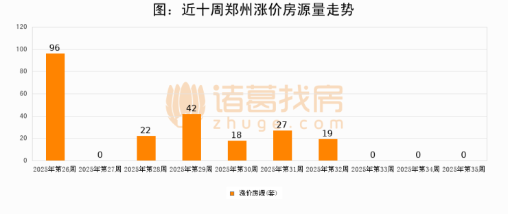 从调价房源来看,第35周郑州涨价房源0套,较上周持平。与此同时,35周涨价房源占比持平