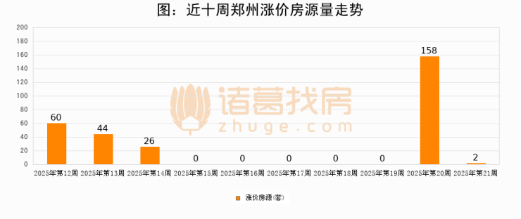从调价房源来看,第21周郑州涨价房源2套,较上周下降98.7%。与此同时,21周涨价房源占比回落0.38个百分点,业主信心小幅波动,购房者可则需入市。