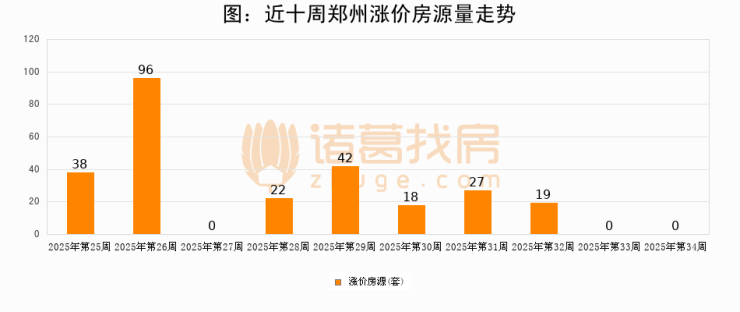 从调价房源来看,第34周郑州涨价房源0套,较上周持平。与此同时,34周涨价房源占比持平