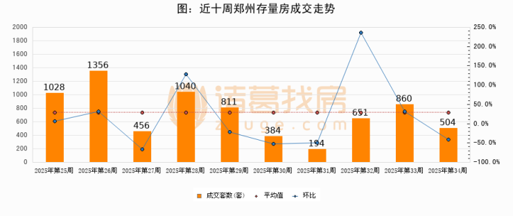 存量房方面,第34周郑州存量房成交504套,较上周减少356套,环比下降41.4%。从近十周成交走势来看,周均成交套数为728套,本周低于平均水平30.8%。