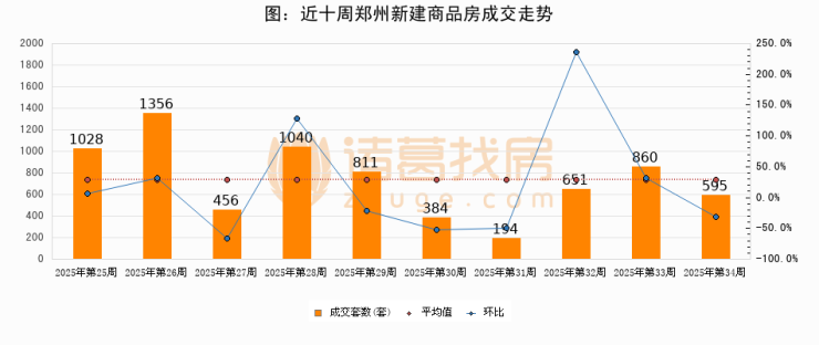 进入2025年第34周(08月18日-08月24日),郑州新建商品房成交595套,较上周减少265套,环比下降30.8%
