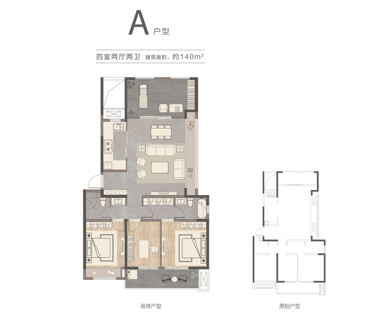 A户型:建面约140㎡(四室两厅两卫)